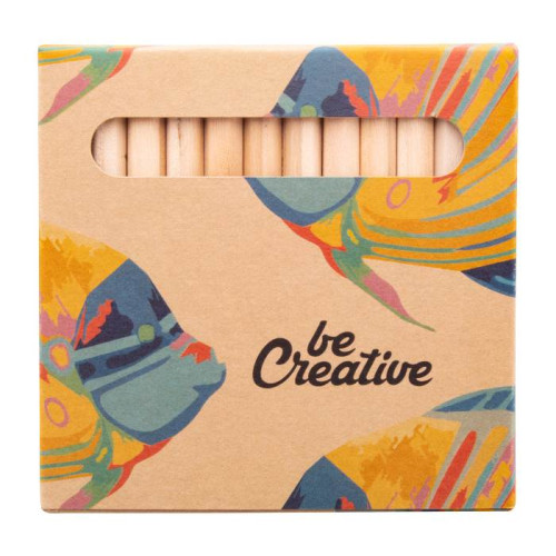 Drvene olovke u boji (12 kom) u kutiji s kraft papirom u punoj boji. Cijena uključuje digitalni tisak. MOQ: 100 kom.