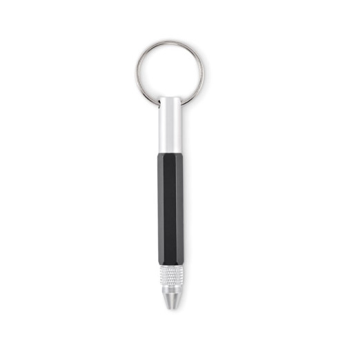 Key ring with twist action pen in recycled aluminium with 4cm/ 1,5 inch ruler, stylus and 2 in 1 phillips and flat head screw driver. Black ink.