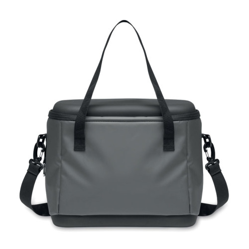 Cooler bag in 50C tarpaulin and top/bottom in rigid PEVA and bottle opener on the side. Including 1 front pocket and 1 inner mesh pocket. Isolation material: PE foam layer. Includes 2 handles and 1 adjustable and detachable strap. Capacity 16L.