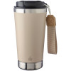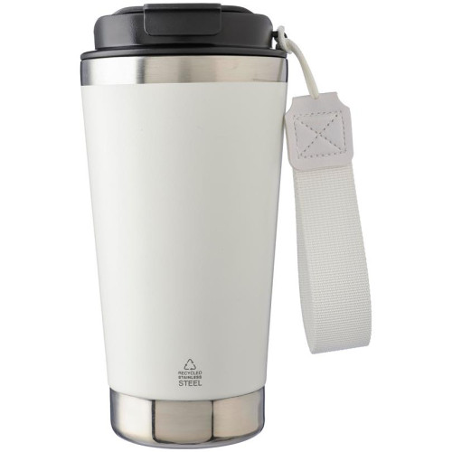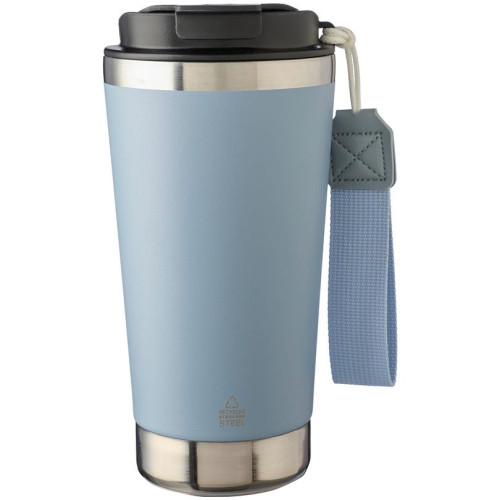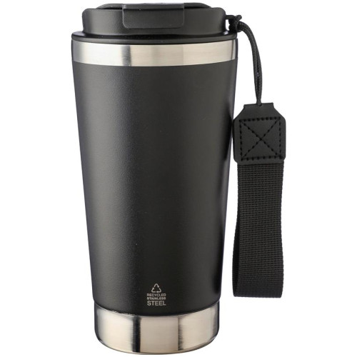 Šalica za piće s dvostrukim stijenkama od recikliranog nehrđajućeg čelika (500 ml) s PP poklopcem i odgovarajućim remenom za nošenje. Unutrašnjost je izrađena od nehrđajućeg čelika 304, a izvana od nehrđajućeg čelika 201. Održava sadržaj toplim 5 sati i hladnim 8 sati. Reciklirani logo ugraviran na bocu. Pojedinačno pakirano u smeđu kartonsku kutiju.