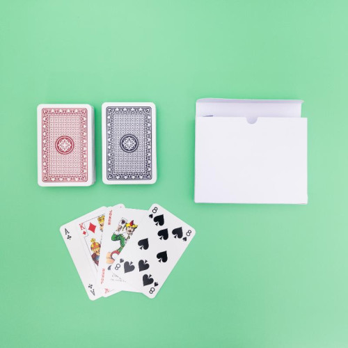 Set klasičnih karata za bridž, remi, poker ili kanastu sadrži 2 x 55 karata + kutiju. Prednja strana karata ima međunarodni motiv, poleđinu i kutiju možete sami dizajnirati. Ukrasite karte i kutiju logom ili sloganom vaše tvrtke.