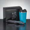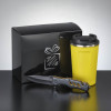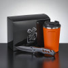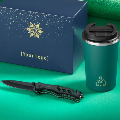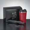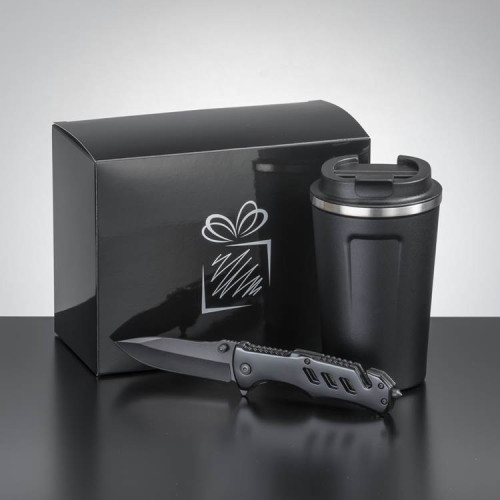 Praktičan set za vozača automobila. Termo šalica za kavu ima izvrsna izolacijska svojstva (održava toplinu do 6 sati i hladnoću do 12 sati). Nož za spašavanje može se koristiti kao rezač sigurnosnog pojasa automobila i ima razbijač prozora na kraju. Opremljen je sigurnosnom blokadom koja sprječava slučajno zatvaranje noža tijekom uporabe. Proizvod je pakiran u crnu kartonsku kutiju.