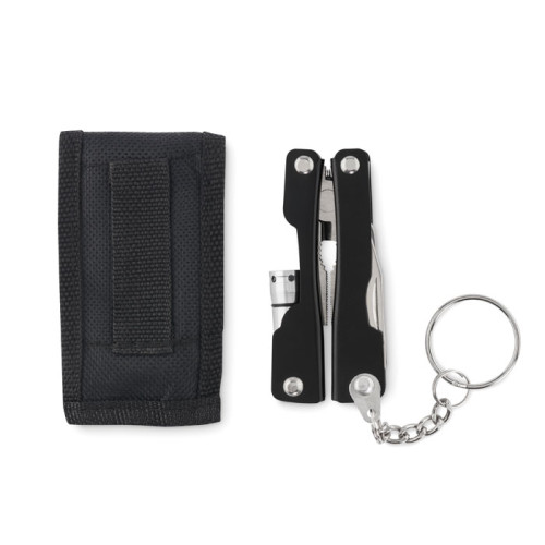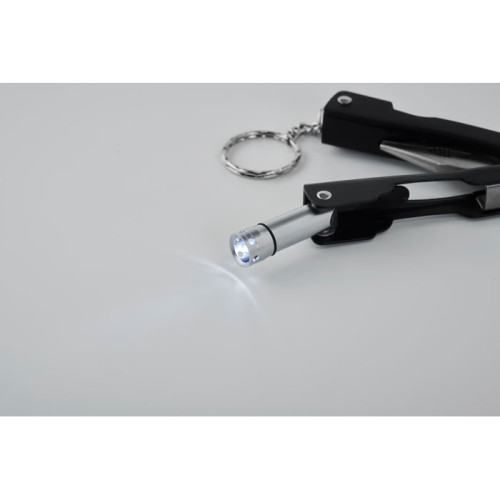 Sklopivi višenamenski nož sa svjetiljkom od nehrđajućeg čelika. Uključuje 10 funkcija alata uključujući torbicu od 600D poliestera. Uključujući 3 x AG3 gumbaste ćelije.