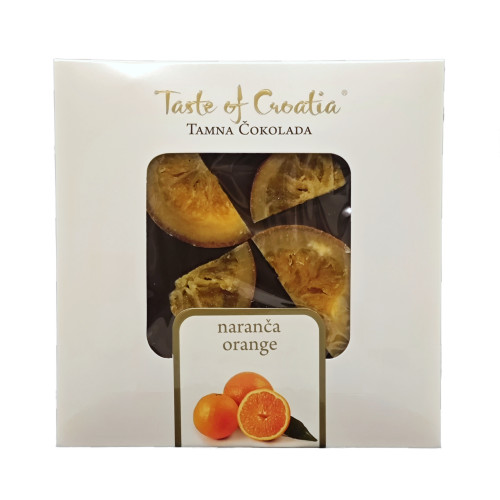 - Naranča – tamna čokolada s dodatkom kriški kandirane naranče. Spoj intenzivnog kakaa i osvježavajuće naranče. Težina: 90 g