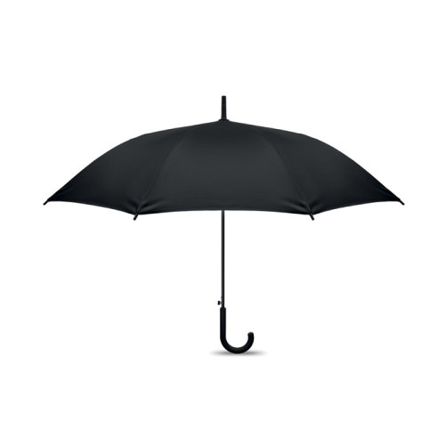 23 inch straight auto open windproof umbrella with full fibreglass frame and panels in 190T pongee fabric. Plastic tips and top. Rubberized PP plastic curved handle. Manual closure.