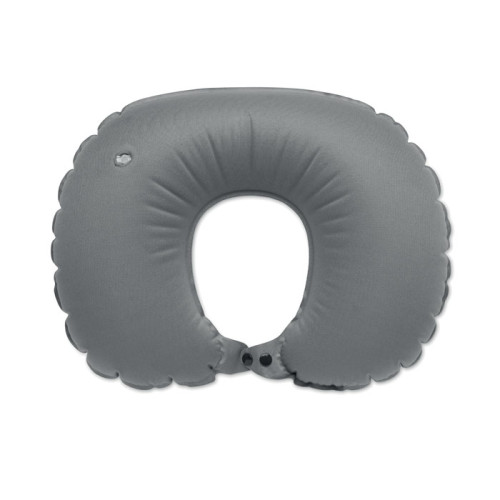 Fast inflatable pillow in milk silk fabric with built-in pump and release system. Pouch in self-material.