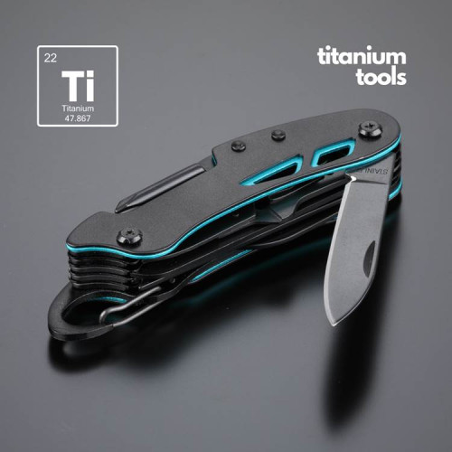 Džepni nož nova verzija proizveden je od visokokvalitetnog nehrđajućeg čelika sa slojem od titana, što mu daje povećanu tvrdoću i dodatnu otpornost na koroziju. Najvažniji elementi: škare, nož, pila za drvo, otvarač za boce i limenke, strugač za ribu, vadičep, bušilica (za bušenje npr. limenke soka), urezivač konca (za krpanje zračnica, šivanje splavi, krpanje gume), turpiju za nokte i križni odvijač. Džepni nož ima i karabiner, tako da ga uvijek možete nositi sa sobom.