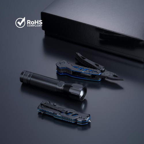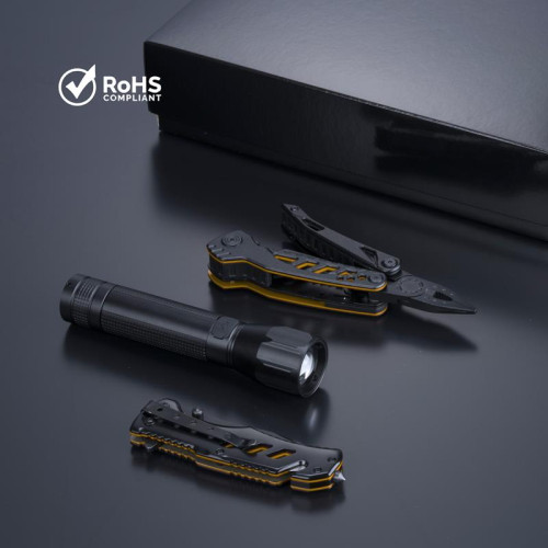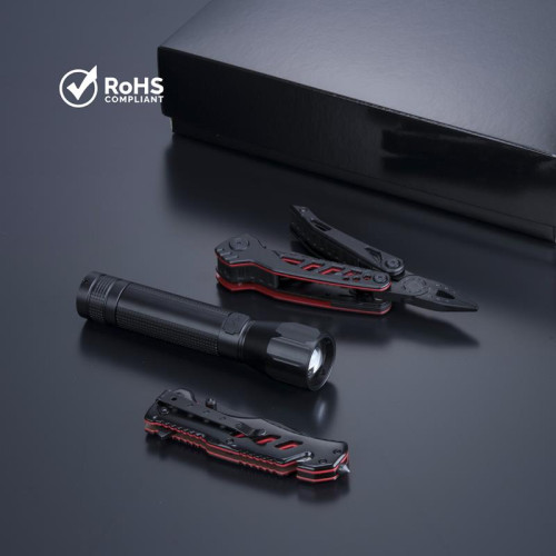 Praktičan set iz kolekcije Optima, koji uključuje veliki višenamjenski alat, nož za hitne situacije i veliku svjetiljku. Višenamjenski alat ima univerzalne kliješta na bazi i uključuje pilu, nož, križni i plosnati odvijač, otvarač za boce i konzerve te turpiju za nokte. Također ima Safe funkciju koja sprječava slučajno zatvaranje noža, osiguravajući sigurnost korisnika. Sklopivi nož za hitne situacije opremljen je sigurnosnim mehanizmom tipa liner lock koji sprječava zatvaranje oštrice tijekom uporabe. Njegova ergonomska drška završava čvrstim razbijačem stakla i rezačem pojaseva. Svjetiljka je izrađena od visokokvalitetnog aluminija, što jamči trajnost i otpornost na oštećenja. Ima stroboskopski način rada i funkciju zumiranja za prilagodbu svjetlosnog snopa. Svjetiljka se puni putem kabela. Pakirano u crnu kutiju.