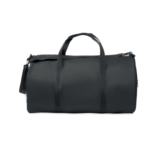 Duffle bag in 600D RPET polyester with PU coating. Front zippered pocket. Inside 210D RPET polyester lining. 1 side zippered compartment / 1 side mesh compartment. Zippered pocket inside.