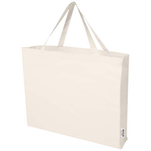 The oversized Odessa tote bag made from 100% GRS recycled cotton is designed for comfortable carrying with its 30 cm long shoulder handles and extra large main gusset compartment. Whether it is to carry around heavy books or groceries, this bag is designed to cover all needs. Print methods available for this tote bag are also certified, making sure that the entire supply chain is transparent and certified. The 220 g/m² cotton ensures durability and reliability, giving the bag a resistance of up to 10 kg weight. Made in India.