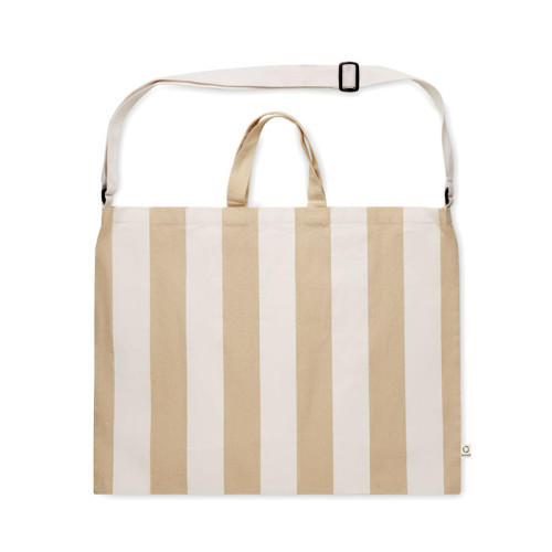 Extra large striped beach bag in 280 gr/m² recycled cotton (80%) and recycled polyester (20%) with inner pocket. Short handles and one large adjustable shoulder strap.