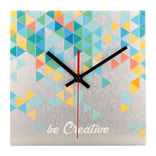 Izrađen po narudžbi, kompozitni zidni sat od brušenog aluminija s prilagođenom grafikom u kvadratnom obliku. Radi s 1 AA baterijom, bez baterije. Cijena uključuje UV LED tisak. MOQ: 25 kom.